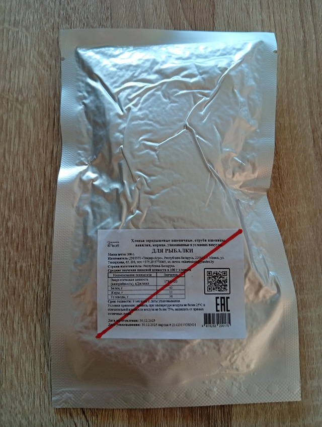 Смесь для рыбалки, на основе хлопьев зародышевых пшеничных, отрубей пшеницы, ванилина и корицы.